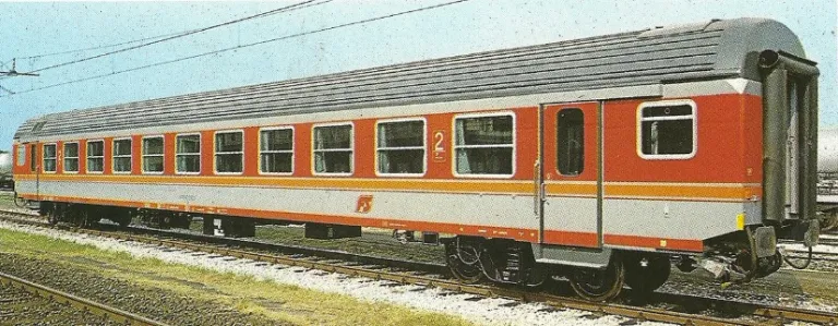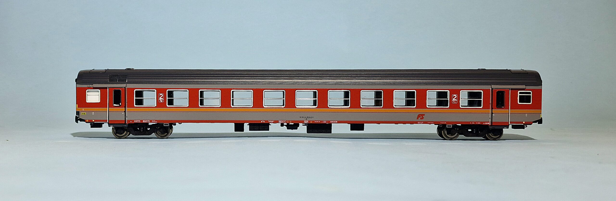 Carrozza MDVE di 2^ classe con illuminazione interna, nella livrea d’origine grigio/rosso con logo inclinato delle FS. Con illuminazione interna. Epoca IV.